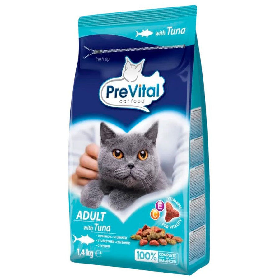 A PreVital Adult tonhalas száraztáp a felnőtt cicák mindennapjaira készült: egyszerűen adagolható, stabil választás, ha olyan eledelt szeretnél, amit könnyű beilleszteni a napi rutinba. A receptúrában hal és halszármazékok is szerepelnek (a tonhal a színezett tápszemekben jelzett arányban), az analitikai adatok szerint pedig a fehérje–zsír arány és az omega-6 zsírsav tartalom a mindennapi kondíció fenntartását célozza.